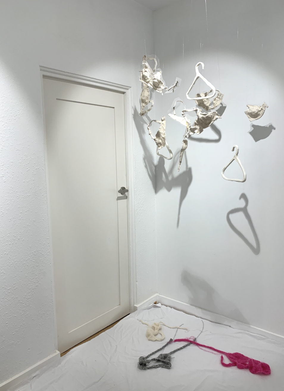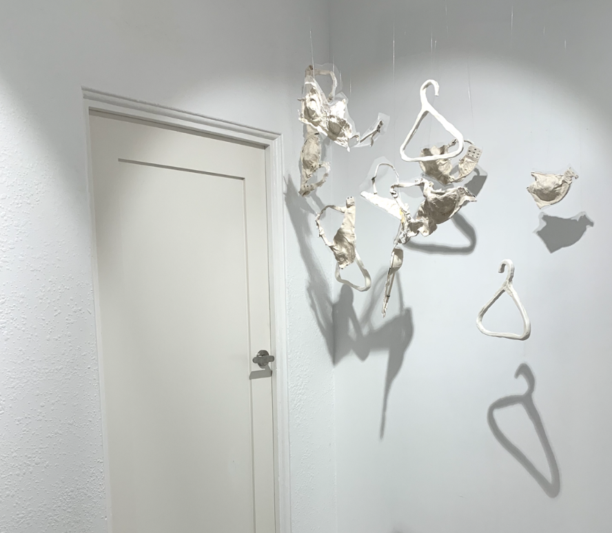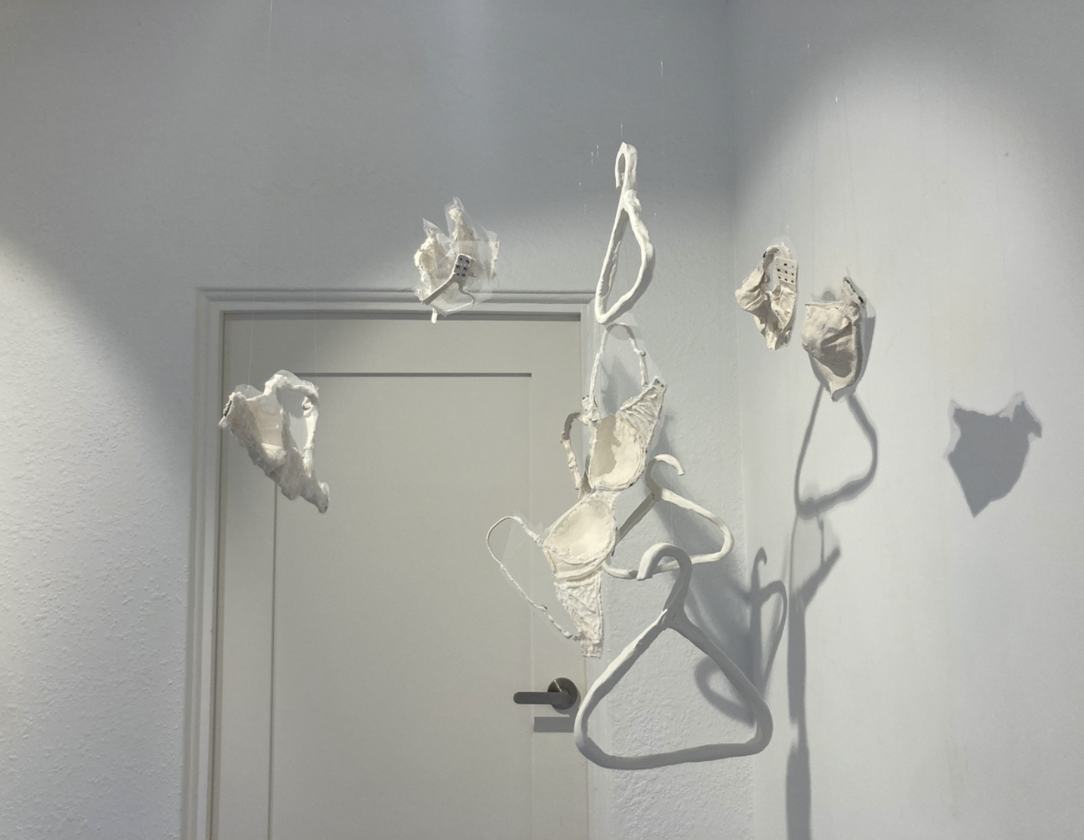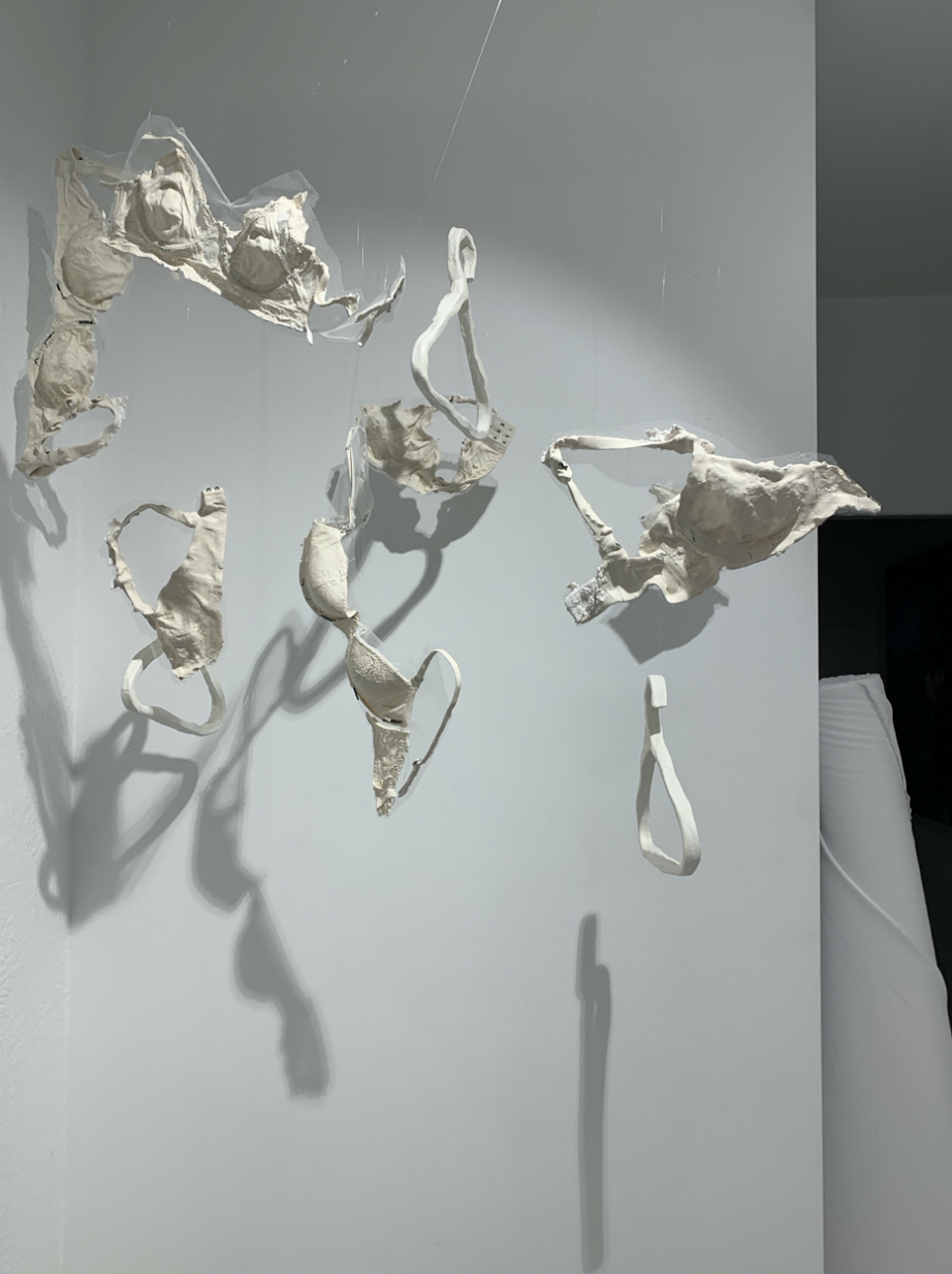 In this ceramic, sculptural installation, I toyed with the idea of paradoxes through making something that is conceptually and physically soft and transforming it into something hard. This being a bra now made into a porcelain object made from slip-cast via the burnout method. Thus, inspired by the ‘freedom trash can’ of 1968 that involved burning ‘instruments of female torture’ in second-wave feminist protest, I burned my bra’s to reclaim my body. This phantom relief from patriarchal ideals is lived through the suspension of ceramics.