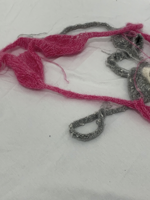 In juxtaposition with this, the ‘softness’ of the knitted mohair displayed strewn across the floor underlines the literal and conceptual ‘fall from grace’ of patriarchal expectations. Further, I attempt to challenge specific qualities and characteristics men have imposed upon women, such as the motherly ideals associated with the act of knitting. The coat hangers made by one part mould-making make overt the female experience of theatrum mundi, as life is just wondering what costume or personality mask we will be forced to wear next. Further, the use of fishing line to hold up the subjects of the artwork embodies this puppeteering of all those who live in the peripheral to the patriarchy. Ultimately representative of the aforementioned, the whiteness of the above is obstructed by their ‘colourful expectations’ of the saturated below.