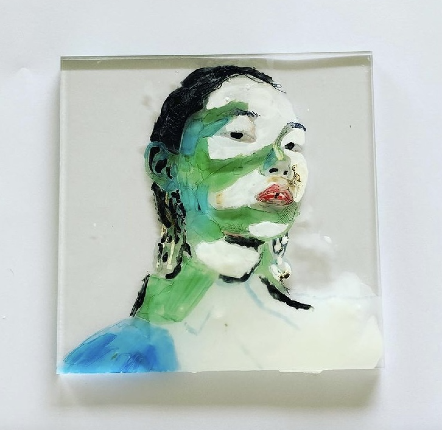 Green GirlPainting, 2020 Wax, nail polish, cotton string, glue and acryllic blowtorched on perspex. 2020.200mm x 200mm